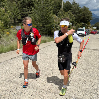Nejprve běžíme po asfaltu, ale ten rychle přechází ve známou šotolinu, ta je mi příjemnější, takže jsem spokojen. Cesta není strmá a zhruba 8 km se dá i běžet. Jirka je velkou motivací nezpomalovat a chodecké úseky maximálně zkracovat. Je to fajn, po více jak 10 hodinách samotky, být s někým v kontaktu. Dostáváme informaci, že náš náskok je již 30 minut. V tomto kopci chci závod definitivně rozhodnout a případným zájemcům o cílové drama to znechutit. Proto i závěrečnou strmou část, kde jsem extrémně rád za hole, společně s Jirkou „vyletíme“. Posledních 10 km je před námi. Nahoře běžíme v lehce zvlněném terénu náhorní plošiny a vychutnáváme si netradiční krajinu. Jsem stále v krátkém, a i zde je teplota na sluníčku příjemná. Měkká cestička pod nohami, okolo od slunce vysušená tráva, hromady pováleného kamení v zeleni a výhledy široko daleko. Jirka upozorňuje na nutnost jíst a pít. Kilometry už zase naskakují rychleji a nohy stále drží. První náznak křečí do levého třísla, který přišel při stoupání v chodecké vložce naštěstí zmizel a já mohu bez větších grimas ve tváři pokračovat dál. Závěrečných 7 km sbíháme opět po širokých šotolinových cestách s četnými serpentýnami. Náskok máme luxusní, takže přestávám pochybovat o své dominanci v tomto závodě. Po očku sledujeme čas a zvažujeme možnost útoku pod 12:00 hodin. Jiřík hecuje. Nechci však nic riskovat a držíme současné tempo. Lehce po 12:00 hodinách opravdu spatřujeme cílové bannery s obloukem. Voláme na holky, které na nás v cíli čekají a s úsměvem se přibližujeme. Nyní již mohu přijmout první gratulaci od Jiříka. Dokázali jsme to!!! Cílem za ohlušujícího potlesku a řevu 6 přítomných lidí (včetně Karči a Majdy) proskakuji. Můj cílový čas je 12:04:09 hod. Jako druhý dokončuje Pavel Blagikh v čase 12:42:05 a bronz bere loňský vítěz Rafael Espinar za 13:34:30.